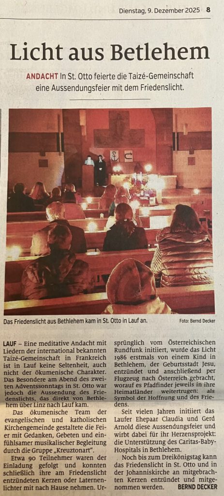 In der ökumenischen Taizé-Andacht in der katholischen Kirche St. Otto, Ottogasse 5, am Sonntag, 7. Dezember, um 18.30 Uhr, wollen wir das Friedenslicht aus Bethlehem in Lauf an der Pegnitz empfangen und für den Frieden im Heiligen Land, bei uns und in der ganzen Welt beten. Gerne können Sie es von da aus mit nach Hause nehmen und weitergeben, am besten eine Laterne für den Heimweg mitbringen.